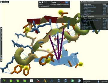 Credit: FoldIt Team/University of Washingtonبازیگران غیر حرفهای یک بازی کامپیوتری نشان دادند که در حل مساله تعیین ساختار پروتیینها میتوانند از ابرکامپیوترها پیشی بگیرند. در این بازی که فولدیت (FoldIt) نام دارد، بازیگر باید از شهود خود کمک بگیرد تا ساختار سه بعدی یک پروتیین را حدس بزند. با کمینه کردن انرژی تاخوردگی پروتیین، بازیگر میتواند امتیاز بیشتری کسب کند.