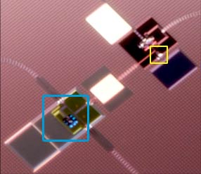 شکل(2): تصویر تراشه ¼" x ¼" که با سیم در کاواک آلومینیومی محکم شده است. تشدیدگر مکانیکی، مستطیل سبز در سمت چپ و پایین تراشه است (شکل 1 را ببینید). مستطیل سفید کوچکتر در طرف راست نوسانگر خازنی است که تشدیدگر مکانیکی را به کیوبیت جفتیده میکند. (برای مرجع شکل ها به آدرس وب زیر لطفا مراجعه کنید.)