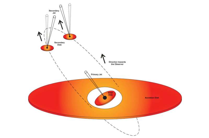 تصویرسازی از سامانه اخترفیزیکی پیشنهادی OJ287. منبع: arXiv (2025). DOI: 10.48550/arxiv.2510.06744.