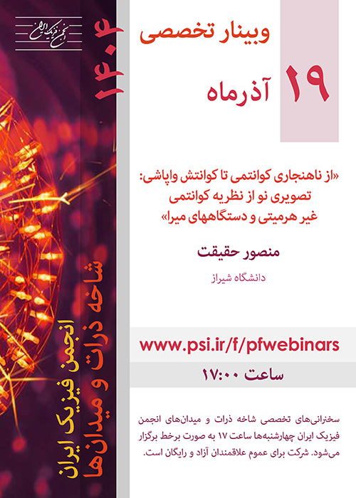 پنجاه و چهارمین وبینار شاخه ذرات و میدانهای انجمن فیزیک ایران توسط دکتر منصور حقیقت از دانشگاه شیراز با عنوان « از ناهنجاری کوانتمی تا کوانتش واپاشی: تصویری نو از نظریه کوانتمی غیر هرمیتی و دستگاههای میرا » در روز چهارشنبه نوزدهم آذرماه ساعت هفده برگزار خواهد شد.