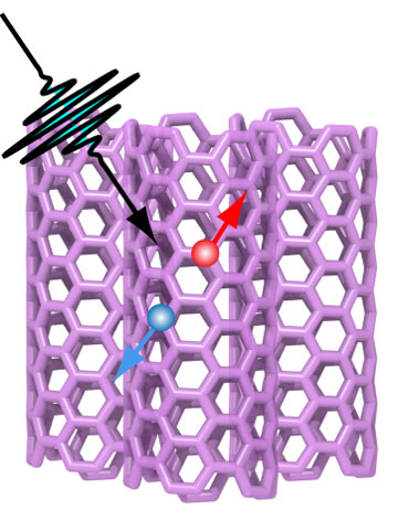 رهایی: فوتون به دستهی نانولولههای کربن میخورد و اکسایتون میسازد یعنی الکترون و حفرهئی که به هم مقید شدهاند. این دو در مرز بین نانولولهها بهتندی از یکدیگر جدا میشوند. برای تولید برق در سلول خورشیدی به هر دو مرحله نیاز است. در نانولولهی منفردشده اکسایتون پیش از جداشدن ِ الکترون و حفره دوباره جذب میشود.