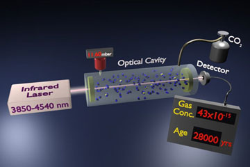 ٢٢ دسامبر٢٠١١ - بیش از۵۰ سال است که با آنالیز مقادیر بسیار کم کربن ١٤ عمر مواد آلی را پیدا میکنند. اینک پابلو کانچیو پاستور و همکارانش در مؤسسهی ملیی اپتیک و آزمایشگاه طیف سنجی ی غیرخطیی اروپا۲ روشئی جدید برای اندازه گیریی مقادیر بسیار کم این ایزوتوپ به بار آوردهاند. روش آنها طیف سنجی از طریق جذب اشباعی و کاهش تدریجی شدت آن در کاواک SCAR)۳) است که به پای معیار فعلی طیف سنجی ١٤C که با شتابگر انجام می شودAMS)۴) نمی رسد. اما در حالی که AMS نیاز به تأسیسات ویژه دارد، SCAR روی میز آزمایشگاه جای میگیرد و ارزانتر است. همانطور که شکل نشان میدهد به کاواک اپتیکی پر ازدی اکسید کربن، نور پیوسته و پرشدت لیزر ئی که روی گذار مولکولیی خاص ئی در ١٤CO۲ کوک شده است تابانده میشود. وقتی لیزر خاموش شود شدت نور در کاواک هم به علت جذب نور در١٤CO۲ و هم بهدلیل نشت نور کم میشود. چون درخشندگیی نور بیش از توان جذب ١٤CO۲ است، کاهش نور در لحظات اول به دلیل نشت نور است. با اندازه گیری و جدا کردن این اثر خاص پژوهشگران می توانند معلوم کنند چه مقدار از فروکاهش برخاسته از جذب مولکولیست و در نتیجه مقدار ١٤CO۲ معلوم میشود. گروه ایتالیایی میگوید که حساسیت ِ اندازهگیری نسبت ١٤CO۲ به ١۲CO۲ در دستگاه آنها ١٤-١٠×۴⁄۳ است که هنوز یک مرتبهی بزرگی با حساسیت AMS فاصله دارد. با این حال، کانچیو پاستور می گوید که این روش همین الان هم به اندازه ی کافی توسعه یافته است که برای کاربردهای زیست -- پزشکی که به آخرین حساسیت نیاز ندارد مفید باشد.[١]