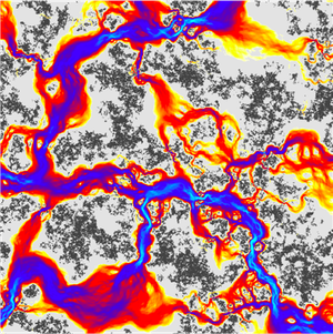 جهیدن یک نشت. درزگیری شبیه سازی شده در این شکل تنها 20 درصد سطحش در تماس با زیرلایه (نواحی خاکستری و پررنگ) قرار دارد. حتی در این حالت نیز جزیان مایع(نواحی رنگی) در طول درزبندی به طور عمده به کانالهای اندکی محدود شده است که منجر به نشت اندک نسبت به مدلهای قبلی که پیشنهاد شده، می شود.