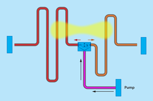 مداری برای تولیدِ میدانهای درهمتنیده با امواجِ میکرو که از نظرِ فضایی، از یکدیگر جدا شدهاند. این شکل، طرحی اولیه و سادهسازی شده از مداریست که Flurin و همکارانش ساختهاند. در اینجا فوتونهای همدوس (که با رنگِ صورتی نشان داده شدهاند) به سوی پیوندگاهِ جوزفسون (جعبهی مرکزی) پمپ میشوند. این پیوندگاه به صورتِ تقویتکنندهای عمل میکند که فوتونهای همدوس را دریافت کرده، درهم میآمیزد و از آنها جفتفوتونهای درهمتنیده میسازد. آنگاه هر یک از فوتونهای مربوط به یک جفتِ درهمتنیده، در طولِ یکی از دو کاواکِ میکروموج (که با رنگهای نارنجی و قرمز نشان داده شدهاند) حرکت خواهند کرد.