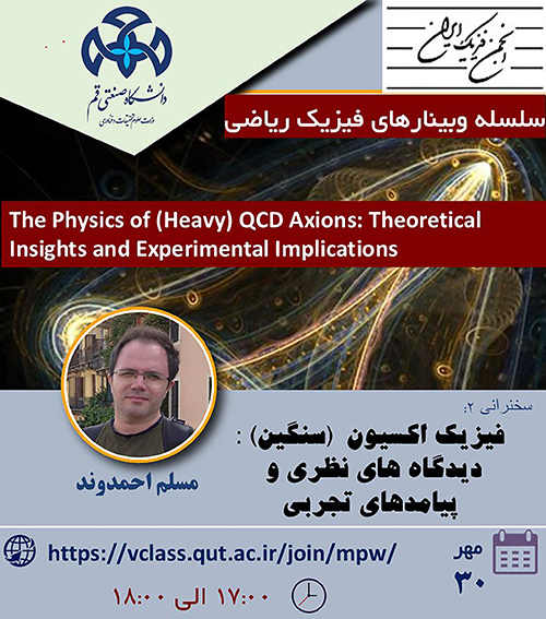 دومین وبینار فیزیک ریاضی به یک سخنرانی تخصصی اختصاص خواهد داشت. دکتر مسلم احمدوند از سخنرانی خود را با عنوان « فیزیک اکسیون (سنگین)-دیدگاه های نظری و پیامدهای تجربی » در روز چهارشنبه سیام مهر ساعت هفده به سمع و نظر علاقمندان خواهند رساند. درچکیده این سخنرانی آمده است: QCD axion models based on the ...
