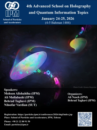 پژوهشکده ذرات و شتابگرها در نظر دارد "چهارمین مدرسه پیشرفته هولوگرافی و اطلاعات کوانتومی" را در تاریخ های 4 تا ۵ بهمن ماه ۱۴۰۴ به صورت حضوری برگزار نماید. کلیه اطلاعات مربوط به کارگاه در نشانی زیر قابل مشاهده است: https://particles.ipm.ir/conferences/2026/shqi/index.jsp ...