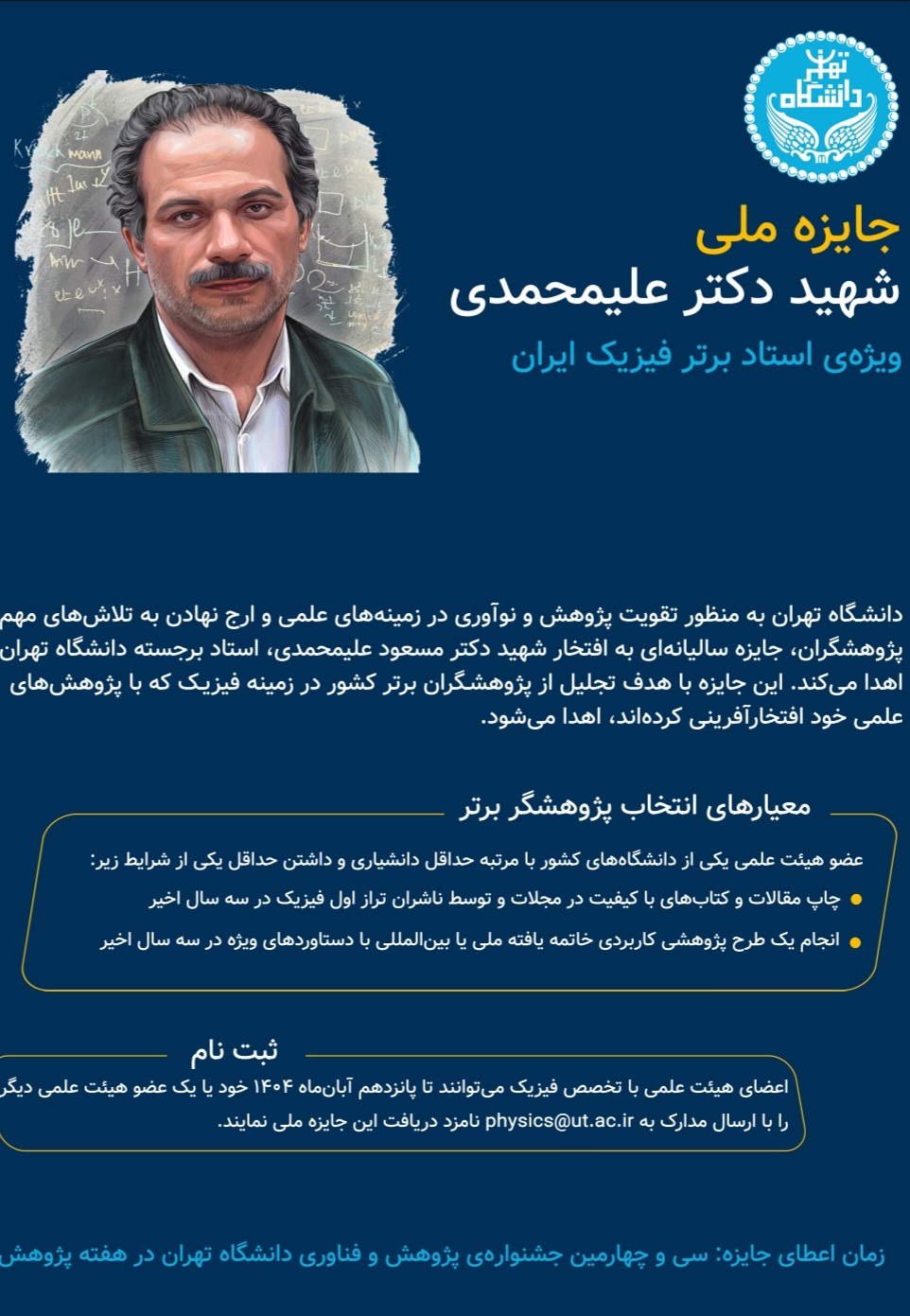 جزئیات بیشترجایزه ملی شهید دکتر علیمحمدی ۱۴۰۴ - ویژه استاد برتر فیزیک ایران
