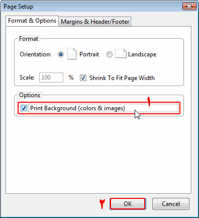 ۲. با انتخاب فوق پنجره کوچک Page Setup باز میشود. در این پنجره از قسمت Options گزینهی Print Background (colors & images) را تیک بزنید و پنجره را OK کنید.