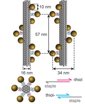 کوزیک و همکارانش از این فرآیند برای پیوند دادن 9 نانو ذره طلا تنها به طول10 نانومتر در طول رشتههای دی اِن ِای برای ساختن شکل مارپیچی استفاده کردهاند. بنابراین ذرات بصورت پله های مارپیچی شکل میگیرند و از آنجا که این فرآیند خودسازمانده است، این شکل دهی بصورت موازی ادامه مییابد. در نتیجه توانای ساخت میلیونها پله مارپیچی را بطور همزمان دارد. این فرآیند بطور شگفت آوری تا 80 درصد دقیق است و یک مارپیچ کامل را میسازد.