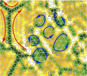 پژوهشگران دو نوع مرز بین تکههای در حال حرکت شناسایی کردهاند. در نوع اول همه میلهها همزمان به مقدار بیشتر یا کمتری در یک جهت حرکت میکنند. در نوع دوم میلهها ی در طرف دیگر خط حرکت، در جهت مخالف حرکت میکنند. این بزرگراه دو خطه برای مثال در مرز بین تکههای کوچکی که هر دو در جهت عقربههای ساعت میچرخند، اتفاق میافتد. آنها دریافتند زمانی که این تکهها توسط نیروهای خارجی به چرخش وادار میشوند، به تکههای در حال چرخش کوچکتری تقسیم شده و زمانی عاقبت از چرخش باز میایستند و دوباره به یکدیگر متصل میشوند و تکه بزرگتری را ایجاد میکنند. این پژوهشگران معتقدند که شکستهشدن به این طریق بهجای چرخش یک بلوک منفرد بزرگ، این امکان را به مایع میدهد که به راحتی در برابر نیروهای چرخشی خارجی عکسالعمل نشان دهد.